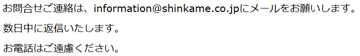 - ドメイン @shinkame.co.jp 、またはshinkame.tv@gmail.com のメールが受信拒否されないようお願いいたします。届かない場合には迷惑メールフォルダーなどもご確認ください。